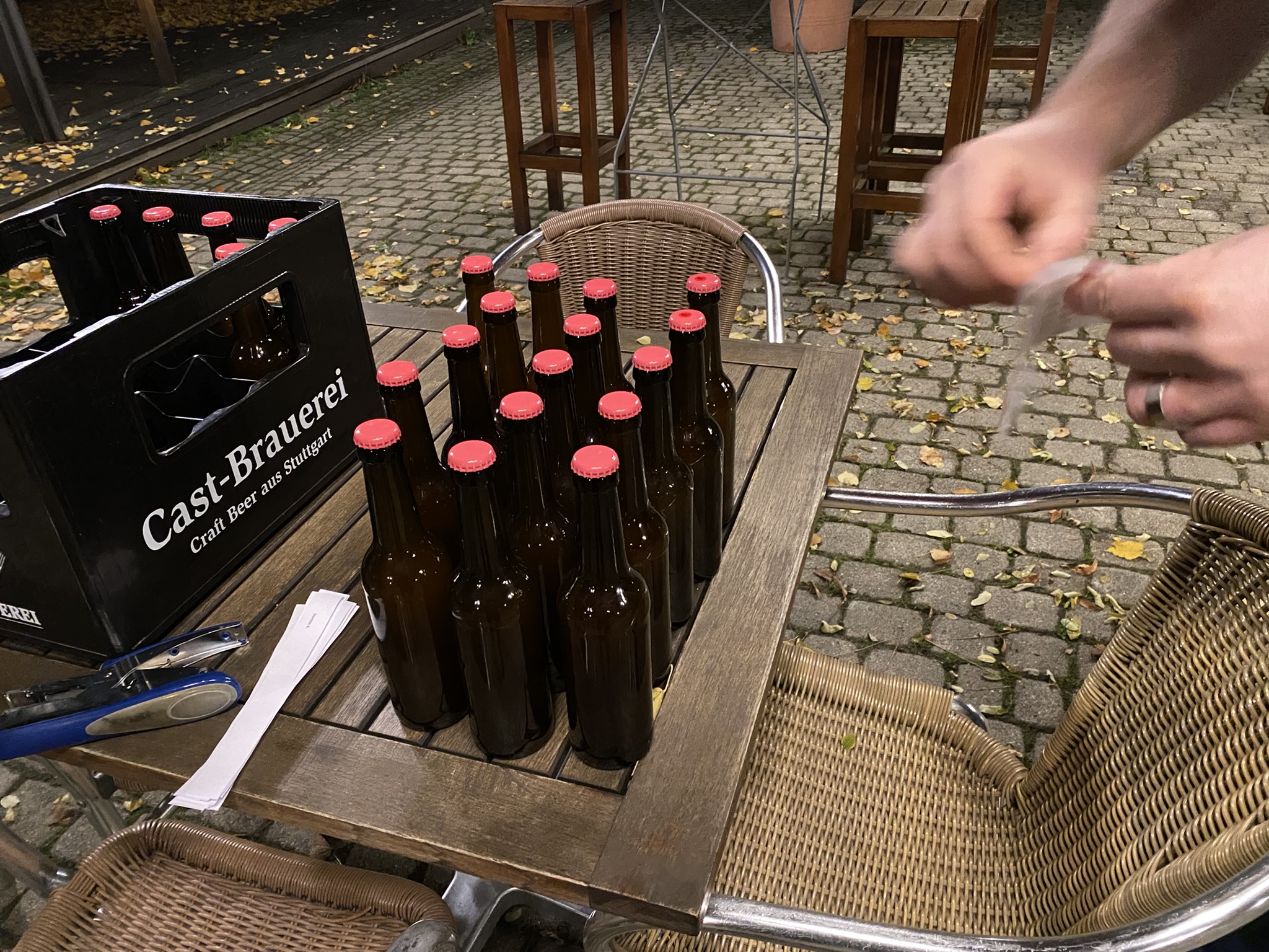 Jeder hat einen Kasten, mit seinem Bier, an einer Zentralen Stelle abgegeben.